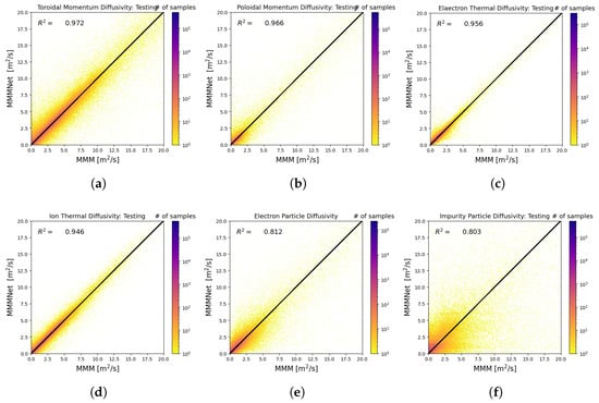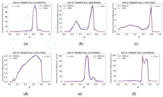 Evaluation of various DIII-D runs shows MMMnet’s strong performance and predictive accuracy for MMM transport coefficients: (a) toroidal momentum diffusivity (); (b) poloidal momentum diffusivity (); (c) electron thermal diffusivity (); (d) ion thermal diffusivity (); (e) electron particle diffusivity (); (f) impurity particle diffusivity ().
