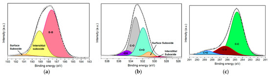 The O 1s spectrum (Figure 2b) was deconvoluted into five components. The two lowest BE components, centered at 529.1 eV and 530.9 eV, correspond to interstitial and surface BxOy species, respectively [32,33,35,36]. The components centered at 531.9 eV and 533.2 eV are associated with C=O and C–O bonds, which arise from atmospheric or solvent-derived carbonaceous residues. Finally, the component centered at 534.6 eV is attributed to hydroxyl (–OH) species on the nanolayers. The C 1s deconvolution (Figure 2c) revealed components centered at 284.8 eV, 286.3 eV, and 288.7 eV, which are assigned to C–C, C–O, and C=O groups, representing 74.3%, 18.9%, and 6.8% of the total C 1s signal, respectively. These carbon species likely originate from unavoidable surface contamination occurring during sample deposition and exposure to air.