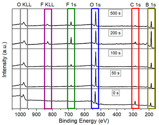 Notably, after 500 s of plasma treatment, the fluorine content continues to increase, reaching 4.7 at. %. However, oxygen concentration also rises to approximately 27 at. %. while boron decreases to around 64 at. %. This behavior may be attributed to prolonged ion bombardment, which could induce surface roughening [37] and a higher density of unsaturated sites [38]. Consequently, upon exposing the sample to ambient air, these reactive sites rapidly interact with atmospheric O2 and H2O, partly reconstituting a superficial suboxide layer. Trace elements such as N and Na remain relatively constant throughout the process, indicating that plasma primarily influenced the surface dynamics of boron, fluorine, and oxygen species.