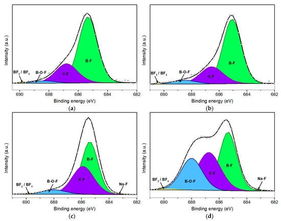 It is important to highlight that a minor component associated with B–F bonding is observed at approximately 190.7 eV. However, due to the relatively low concentration of fluorine and the predominant presence of boron and oxygen species, this peak remains minor and provides limited analytical insight. In this regard, the deconvolution of the F 1s peak proves to be more informative for characterizing the fluorination process.