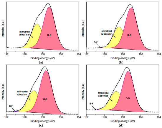 A more pronounced peak appears at a slightly higher BE (685.1 eV), which is attributed to B–F bonding. This observation indicates that fluorine atoms are preferentially bonded to coordinatively unsaturated boron sites. Such bonding predominates at shorter plasma exposure durations, specifically at 50 s (Figure 4a) and 100 s (Figure 4b), where the B–F component accounts for approximately 70% of the total F 1s peak area. In contrast, for the sample subjected to 500 s of plasma exposure (Figure 4d), this proportion significantly decreases to approximately 38%, coinciding with an increase in the intensity of the component centered at 688.5 eV associated with the formation of B–O–F bonds.
