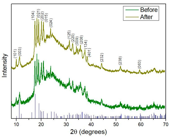 To further confirm that the fluorination process does not disrupt the crystal structure of borophene, additional experiments were performed. In this context, Figure 6 illustrates the XRD patterns recorded before and after plasma exposure. Notably, after fluorine functionalization, no significant differences were observed between the two spectra. This evidence indicates that the plasma functionalizing procedure employed does not damage or alter the crystallinity of the nanomaterial. Furthermore, the XRD data confirm that borophene retains a β–rhombohedral crystal structure (JCPDS 00-031-0207), indexed to the R–3m (no. 166) space group. This diffraction pattern corresponds to the β12 boron phase and agrees with previous studies [29]. Comparative analysis of the XRD patterns demonstrates consistent peak positions and relative peak shapes across all plasma treatment conditions, supporting the preservation of the β–rhombohedral crystal structure.