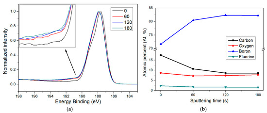 The inset in Figure 7a reveals that, following sputtering, there is an increase in the intensity of the B–F component around 190.7 eV, confirming that fluorine functionalization is not limited to the outermost borophene surface. As expected, the largest contrast occurs between the pristine sample and the one sputtered for 60 s. There is also a further increase in the B–F signal between 60 and 120 s, although the recorded spectrum at 180 s looks quite similar to that at 120 s. This observation aligns well with the depth-dependent elemental quantification shown in Figure 7b.