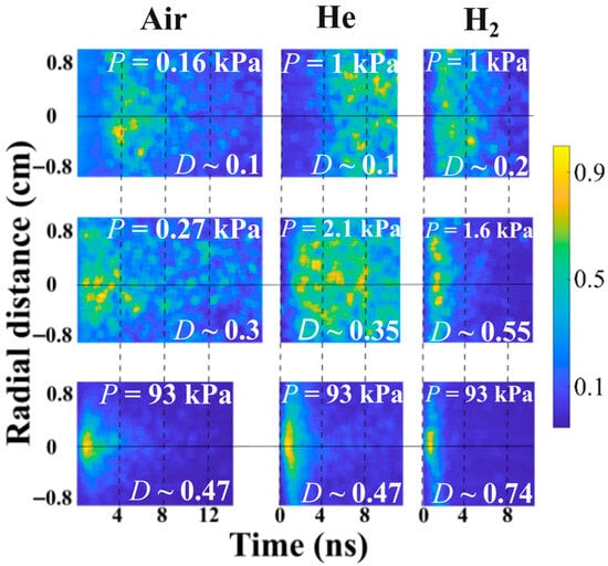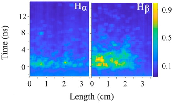 - For hydrogen plasma, at P ≈ 1 kPa, the duration of the light emission is >4 ns [Figure 11d] and at P ≈ 0.28 kPa [Figure 11a], the duration is up to 30 ns. This can be related to the quenching of exited states of hydrogen atoms by molecules observed in our previous experiments [26,56]. Additionally, at P ≈ 1 kPa, the duration of the intense light emitted at Hα, ~2 ns, is shorter than that at Hβ, ~4 ns (see Figure 15), which also indicates the presence of high-energy electrons in the plasma.