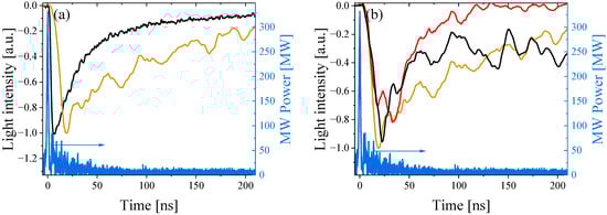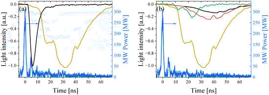- For all studied gases, the intensity of the plasma light emission increases significantly after the HPM pulse has left the observation region which agrees with the data presented in Section 3.2. This continuous gas ionization is explained by high-energy electrons which are held by positively charged plasma.