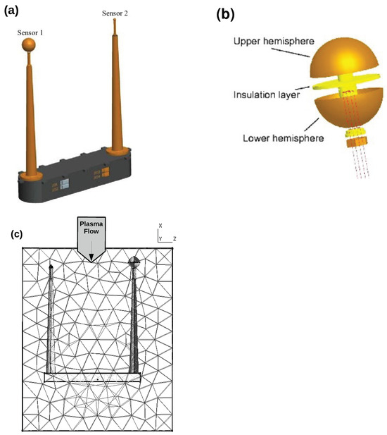 In the simulations, the geometry consists of a rectangular prism representing the electronics box, with two sensors mounted on posts extending approximately 50 cm in the ram direction. Each sensor is divided into an upper and lower hemisphere, separated by an insulating layer: the upper hemisphere acts as the collector, while the lower hemisphere serves as the protective sensor. The extension bars and electronics box are modeled as perfect conductors, represented by triangular surface meshes at the boundary as shown in Figure 1c. The mesh is adaptive, and the large triangles seen in Figure 1c are faces of tetrahedra at the boundary. The floating potential of bars and box, together with that of the spacecraft body, is computed self-consistently from the balance of collected electron and ion currents. To avoid boundary effects, the computational domain is chosen large enough to fully enclose the sheath and wake regions, typically extending 10–50 times the probe size or several Debye lengths in each direction. The mesh, created with Gmsh, an open-source finite element mesh generator by Geuzaine and Remacle [30], is shown in Figure 1c. PTetra uses non uniform tetrahedral mesh with finer mesh (about 4–5 mm) in the region of interest that is around the LAP and a coarser mesh (about 8 mm) farther away. The mesh resolution varies from approximately 4 mm on the Langmuir probes, to 1 mm on the extension bars, and 6 mm on the supporting electronics box. The outer boundary stretches outward in all directions from the satellite components for many Debye lengths. It consists of 317,871 vertices and approximately 1.32 million tetrahedral cells. A total of macro particles are used in the simulation domain to simulate the interactions between plasma and the LAP. The statistical weight of each macro-particle is automatically determined by PTetra from the physical plasma density and the domain volume, which in the present simulations corresponds to approximately 25. Initial distribution of the charged particles at time t = 0 is spatially uniform. At steady state, to improve statistical accuracy near the probe, the effective particle density is increased in its vicinity to ensure sufficient sheath statistics while maintaining computational efficiency. The code is designed to determine self-consistent electric fields by considering calculated volume charges and the deposition of charges on different components of satellites.