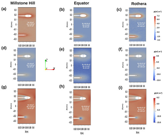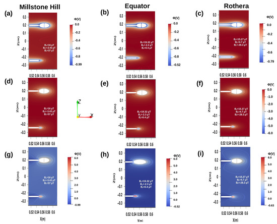 Figure 2 and Figure 3 show the variations in the volume charge density and corresponding electrostatic potential profiles around the LAP obtained from PTetra simulations for floating, negatively and positively bias probes at Millstone Hill, the the Equator, and Rothera. The volume charge density distribution depends on the probe bias, plasma density, temperature, and the ambient magnetic field. In this context, the PIC simulation results in Figure 2a–i illustrate how the charge density around the LAP is modified under different bias conditions and plasma environments. In the floating potential case Figure 2a–c, which corresponds to the equilibrium state where electron and ion currents balance, the resulting charge distribution is relatively weak and symmetric. For a negatively biased probe as shown in Figure 2d–f, electrons are repelled from the surface, leading to a depletion of electron density and the accumulation of excess positive ions in the near-probe region. This produces a sheath dominated by positive space charge. In contrast, for a positively biased probe as shown in Figure 2g–i, electrons are strongly attracted, creating an electron-rich sheath with negative space charge surrounding the probe. The magnitude and spatial extent of these charge density perturbations depend on the local plasma conditions at Millstone Hill, the Equator, and Rothera. At low latitudes, where plasma density and temperature are higher, the sheaths are thinner and more confined. At high latitudes, where the plasma is less dense and colder, the charge distributions are more extended. As mentioned above, the floating potential is the surface potential at equilibrium when electron and ion currents balance and the net current to the surface of the probe is zero [31]. The ambient electrons have a higher thermal speed than the plasma flow speed as given in Table 3. In Table 3, the drift velocity denotes the bulk plasma motion arising from the ambient electric and magnetic fields. It is identical for electrons and ions and distinct from their thermal velocities. The high mobility of electrons compared to ions causes the probes to have a negative floating potential as shown in Figure 2a–c.