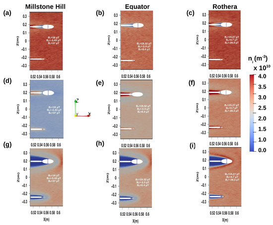 Ion density variations around floating, strongly negative and positive bias LAP obtained from PTetra simulations for Millstone Hill (a,d,g), the Equator (b,e,h), and Rothera (c,f,i). The apparent variations in the background are caused by the individual scaling of each panel, which was chosen to emphasize the wake structures.