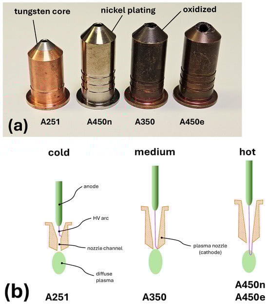 The third nozzle in Figure 1a, coded by two ring grooves, is the medium-hot nozzle A350 [38]. It is not nickel-plated (older type) and had already been operated for about 100 h before the start of measurements. Its plume temperature is between those of A251 and A450n. In A350, the cathodic foot of the arc extends only partially beyond the nozzle channel, resulting in the arc being longer than for A251 but shorter than for A450n, as illustrated in Figure 1b.