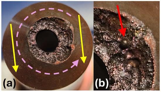 The erosion of the A450e nozzle: (a) The front view. (b) Magnification of a molten ball.