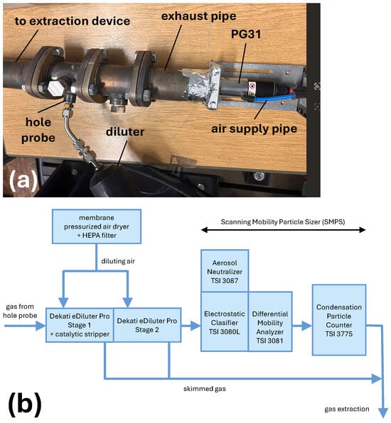 The measurement setup is typically used to investigate motor exhaust gases, but it is suitable for any aerosol. The plasma generator PG31 was inserted into an exhaust pipe, as shown in Figure 3a, and sealed with aluminum tape to prevent any ingress of ambient air. The analyzed gas was taken from the exhaust system using a hole probe (see Figure 3a), and transferred for particle distribution analysis. To achieve a spatially uniform extraction of the exhaust gas across the entire pipe cross-section, a multi-hole sampling probe with an internal diameter of 6 mm was employed. The probe was equipped with fifteen sampling orifices, each 1.5 mm in diameter. The cumulative flow cross-section of all the orifices (26.5 mm2) thus closely matched the internal cross-section of the sampling tube (28.3 mm2), ensuring balanced flow distribution. The fifteen orifices were arranged in three circumferential rows of five holes each, offset by 120° to achieve homogeneous coverage of the exhaust gas stream. The system used for particle measurement, shown schematically in Figure 3b, consisted of a diluting unit eDiluter Pro (Dekati Ltd., Kangasala, Finland) and Scanning Mobility Particle Sizer (SMPS) spectrometer (TSI Incorporated, Shoreview, MN, USA) for measurement of the particle size distribution. This sizer consisted of an aerosol neutralizer TSI 3087, an electrostatic classifier TSI 3080L with the longest differential mobility analyzer (DMA) TSI 3081, and a condensation particle counter (CPC) TSI 3775, where particle diameters between 6 and 220 nm are measured. eDiluter Pro was used to prevent undiluted exhaust gas from entering the measuring device. It operates as a two-stage diluter with an integrated catalytic stripper, and enables dilution rates ranging from 25:1 to 900:1. It draws exhaust gas from the pipe through a heating line at 30 °C, dilutes it, and then sends it to the SMPS for particle size measurement.
