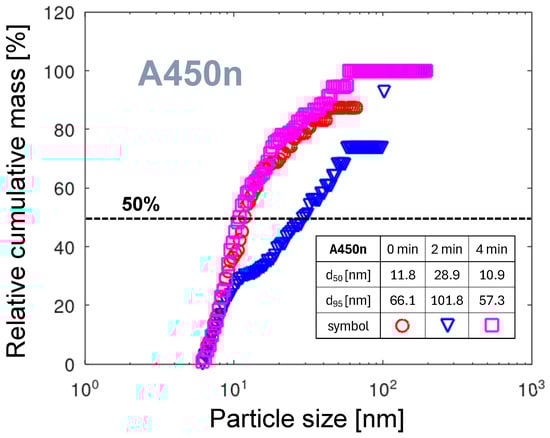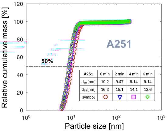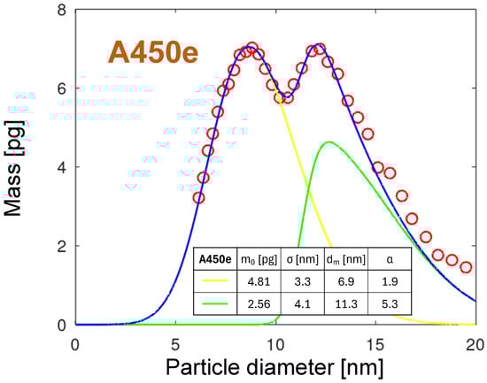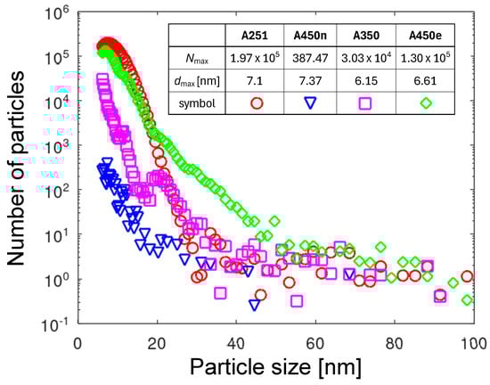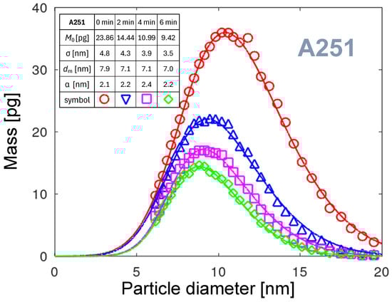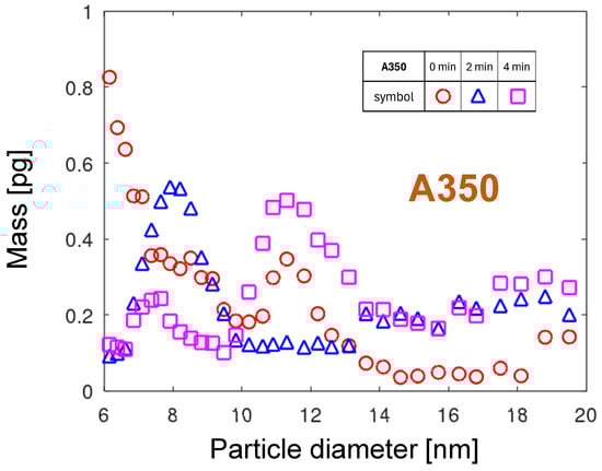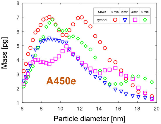 Figure 10 shows four PMDs for the A251 nozzle collected at four times from the start of the measurement. Comparing the PNDs and PMDs for , the substantial shift in the maximum value is observed. The maximum of PND is at a size of 7.6 nm (see Figure 6), but for the PMD it is a diameter of 10.6 nm. Due to its larger volume, the smaller number of particles is carrying a larger mass of the eroded material. The strong shift over time of the maxima toward smaller sizes and masses is observed. It will be discussed in detail in Section 3.5.4.