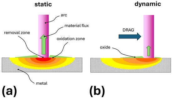 The scenario of the concurrent oxide growth and oxide removal is presented in Figure 5 and discussed in Section 3.6. Figure 5a shows the idealized temperature distribution under the arc foot, when the drag of the gas motion is not sufficient to move the arc. The temperature around the arc was high enough to initiate the oxide growth. Directly under the arc, the temperature was significantly higher, leading to the instantaneous removal of the already-grown oxide. Figure 5b shows how the temperature distribution changes when the arc is moving. Since the interaction time between the arc and the tungsten surface was shorter, the temperature directly below the arc was lower compared with the static case. At the same time, the temperature around the arc was lower, and less oxide was produced. The faster the movement, the less oxide is grown and subsequently removed.