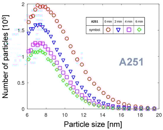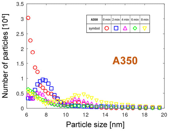 The comparison of the PNDs in Figure 4 shows that the curve for A251 is focused in the range of low size values. Let us take a closer look at the distribution in the size range below 20 nm. In the starting phase of the arc discharge, two characteristic changes of the PND can be observed (see Figure 6). First, the number of emitted NPs decreases with time. Second, the mean NP size decreases. Several factors can be considered as the reason for these effects. On the scale of minutes, the nozzle and the flowing gas are warming up. Generally, increasing the cathode temperature results in greater erosion. However, with increasing gas temperature, the gas volume increases, followed by an increase in the gas velocity and the rotation velocity of the arc foot. Consequently, the residence time of the arc foot at one place gets shorter. The surface reaches lower temperatures. Assuming the NP generation mechanism based on oxide growth and removal described in Section 3.1.1, less oxide grows, and subsequently, less oxide or tungsten can be sublimated. Additionally, by a faster arc movement and gas flow, the aggregation time of particles decreases, resulting in a decrease in the particle mean size [41]. Another phenomenon contributing to the faster arc foot motion is the “polishing” of the tungsten surface by the rotating arc, removing any convex features and preventing lingering of the arc at such places.