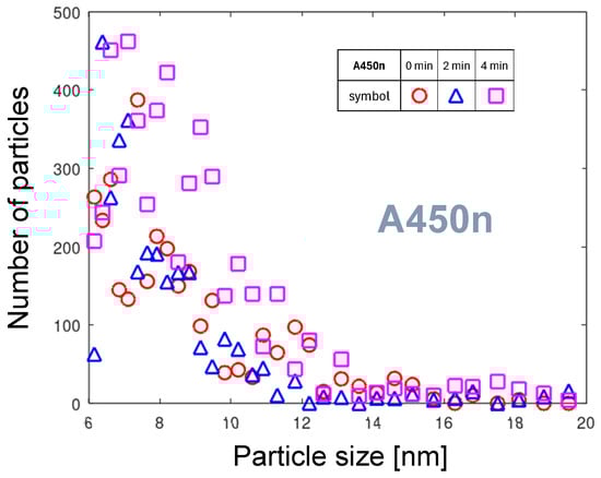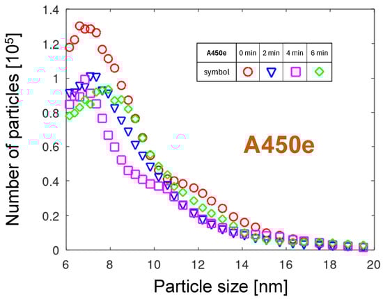 Figure 7 shows the PND collected four times in two-minute intervals after the start of measurement. Analogue to A251, the maximum particle number decreased with time, but the shift in the size of these maxima was not so clear. A distinctive feature of the PNDs of the A450e nozzle, not occurring in the A251 distributions, is its double structure. The most apparent is this effect in the 0 min curve. It resembles an overlay of two PNDs, the first with a maximum at 7.1 nm and the second with a maximum around 9 nm. The bimodal character of the PND was also visible for the 4 min curve. As mentioned in Section 3.1.1, two distinct physical mechanisms can account for these distributions. The first distribution can be related to the atomic-scale erosion of the metallic copper surface and aggregation in the gas phase. The second one can be related to the erosion of the oxidized regions produced at the copper surface. Since copper oxides do not sublimate and grow thicker, a different erosion scenario than for tungsten should be proposed. The presence of oxidized areas forces the arc to move not smoothly but to overjump the strongly oxidized regions, seeking out low-resistivity spots. They can be found at places where oxide is punched by the high-voltage arc. At such spots with a bare metal surface, it remains a little longer. The slower, less smooth movement of the arc produces hotter cathodic spots. A higher atomic concentration of copper and longer available aggregation time promote the production of larger particles. Since the mean time of lingering at one place can vary strongly with time, the particle size distributions change as well.