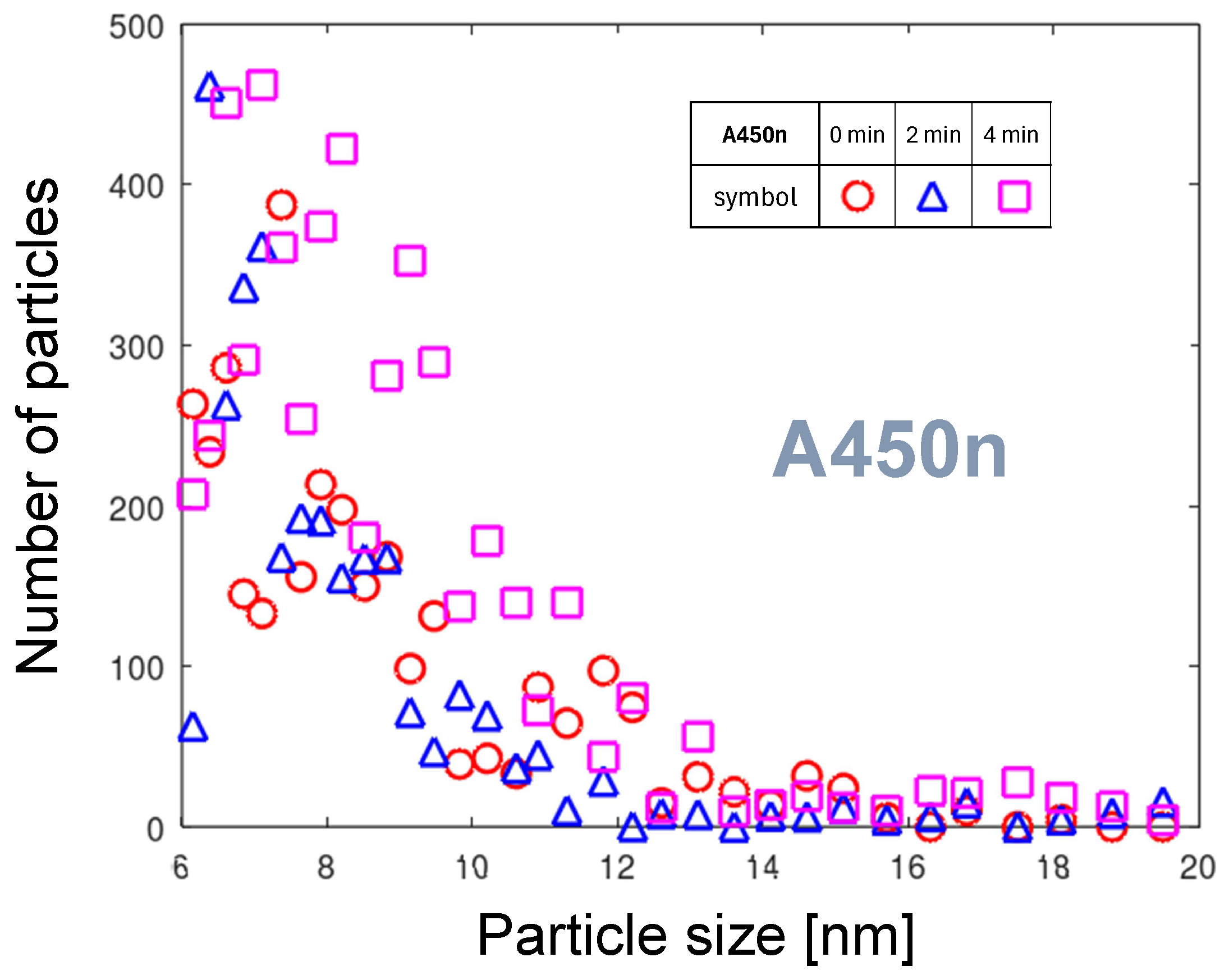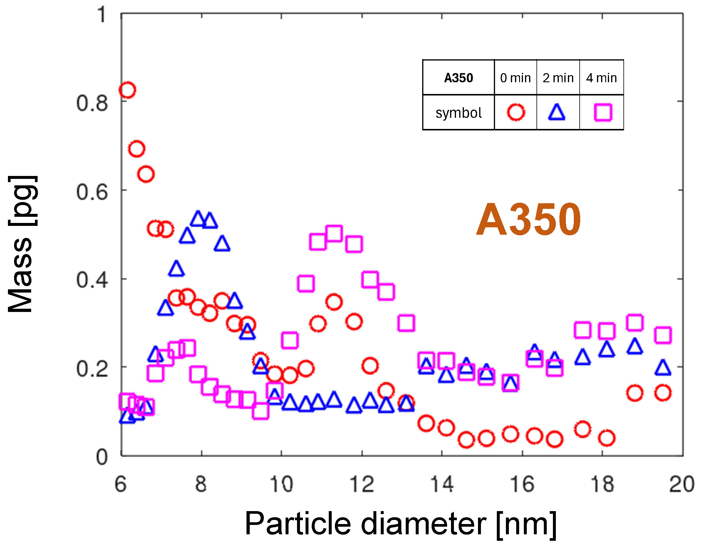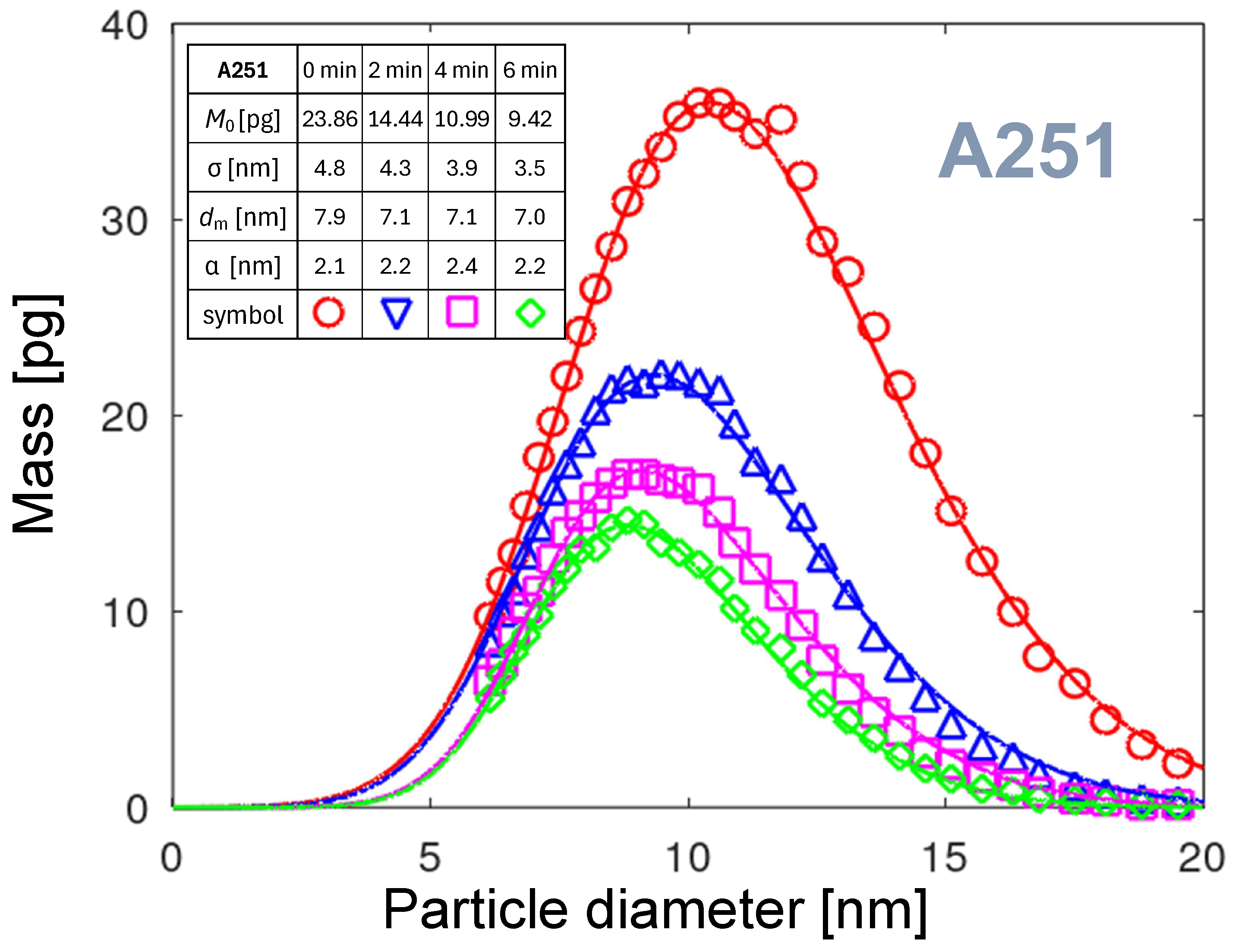 - For the pristine A251 nozzle (tungsten core), the PMDs could be fitted by a skew-normal function. It was much more difficult for A350 or A450e, because the PNDs and PMDs were multimodal and time-dependent, indicating the dynamically changing combination of different physical erosion conditions. The first PMD from the A450e nozzle could be modeled by an overlap of two skew-normal distributions, demonstrating the bimodality of the NP generation.