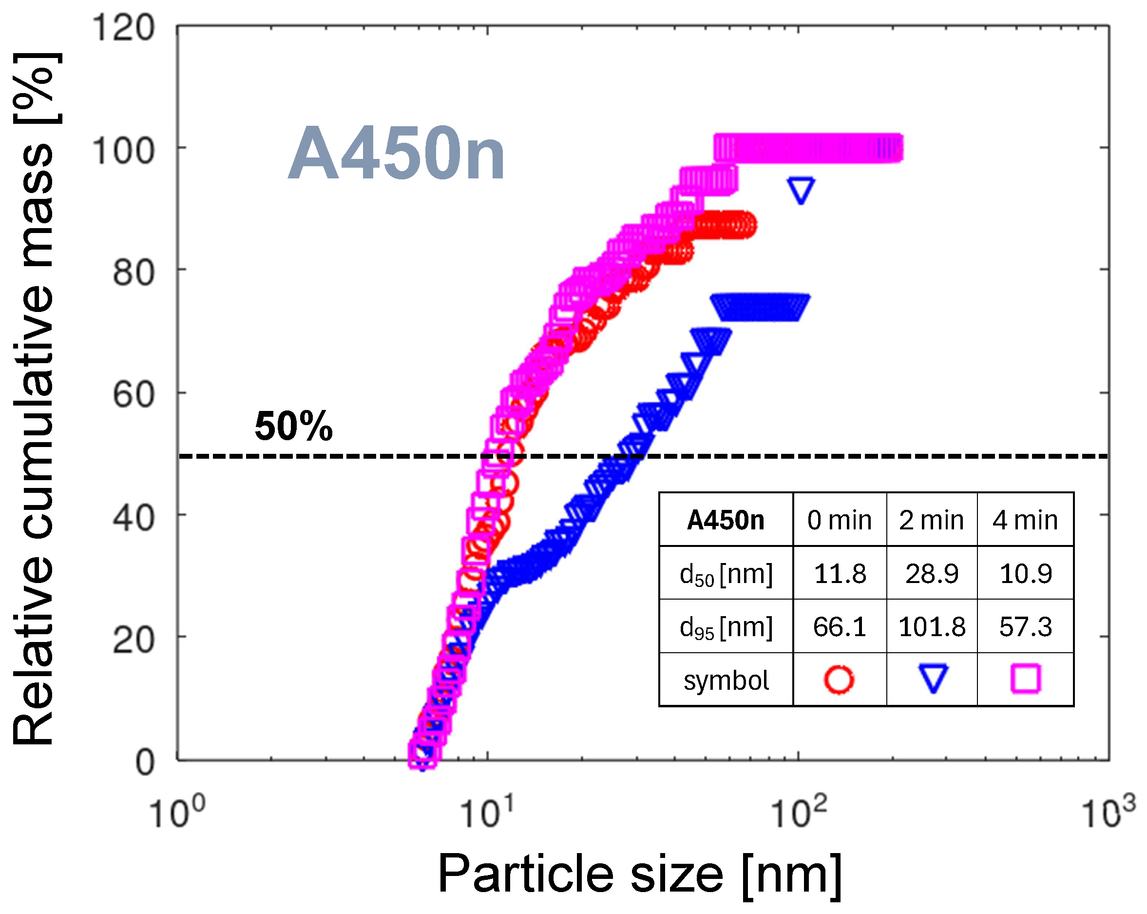 - The highest number of NPs was emitted from the nozzle with a tungsten core (A251). Their PMD was very narrow and time-stable, indicating the constant velocity of the arc movement. Such conditions were most likely due to the elimination of ambient air movement, as the arc developed entirely within the nozzle. The maximum of the PMD could be controlled by temperature. Surface oxidation and subsequent sublimation/evaporation, followed by molecular oxide emission and aggregation, were expected to be the main sources of NPs. The most probable chemical composition of the particles was tungsten trioxide. It made the tungsten-core nozzles a good candidate for the synthesis of WO3 nanoparticles.