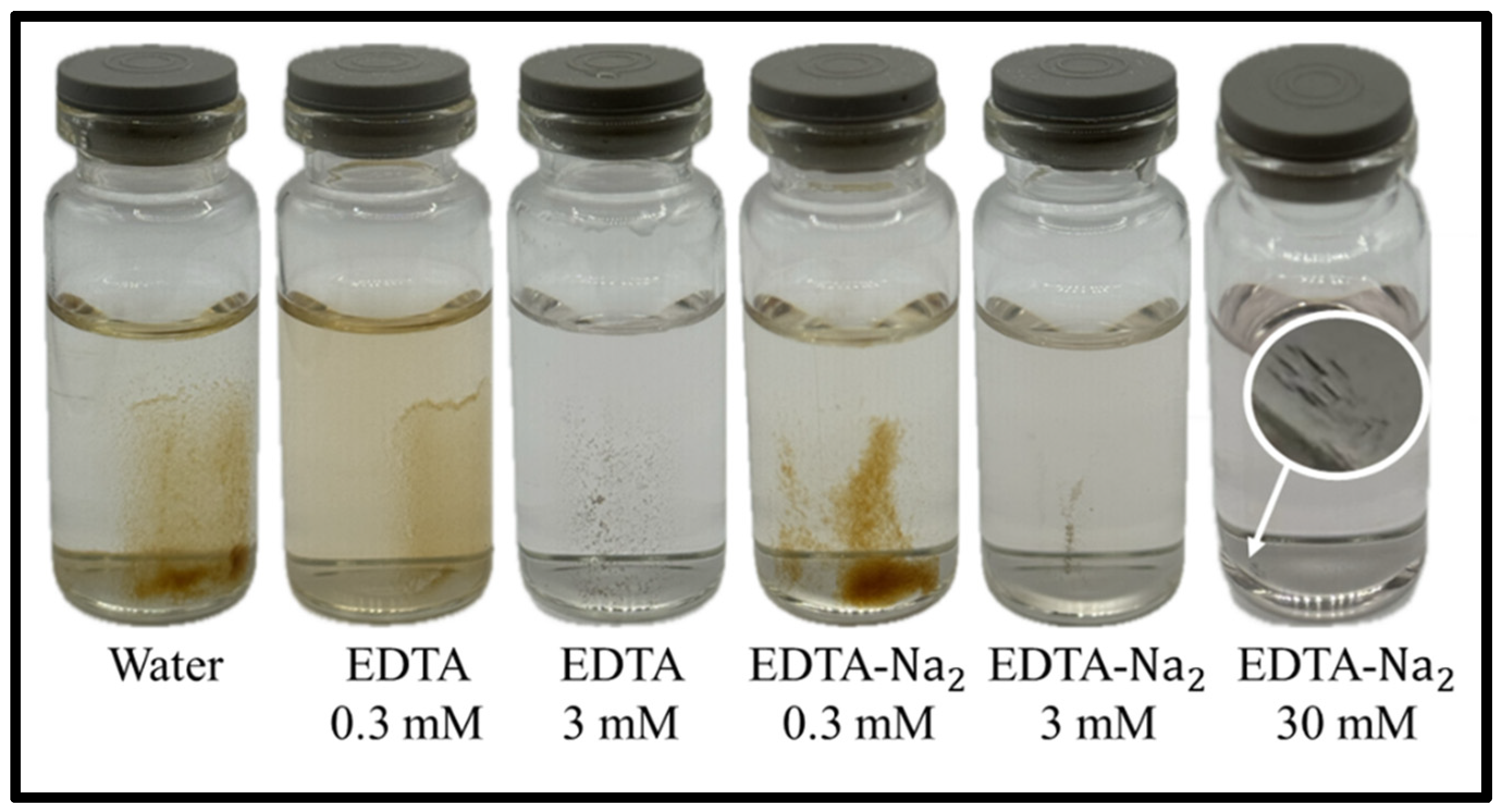 4EDTA, even at pH 3.0, the kinetics of Fe(III) complexation will be very slow. But long-term, it will ultimately undergo complexation with EDTA. When reexamination of the samples was performed after a few months of storage, there was only a single fraction of precipitate—the fraction with the strong reaction on the magnet.