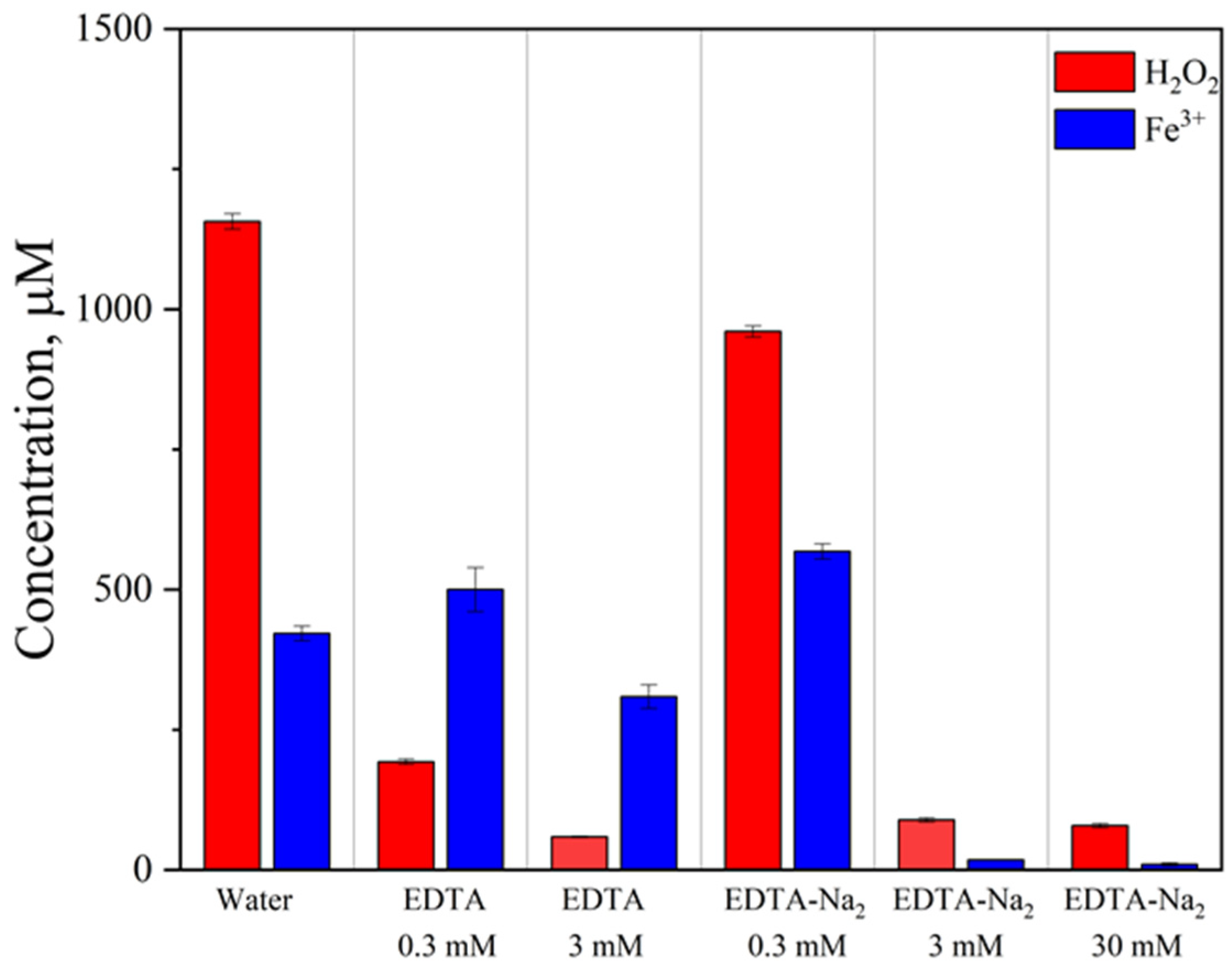 2 concentration was significantly lower, suggesting either the formation of a stable complex with strong intermolecular bonds or the catalytic decomposition of hydrogen peroxide. The increase in EDTA-Na