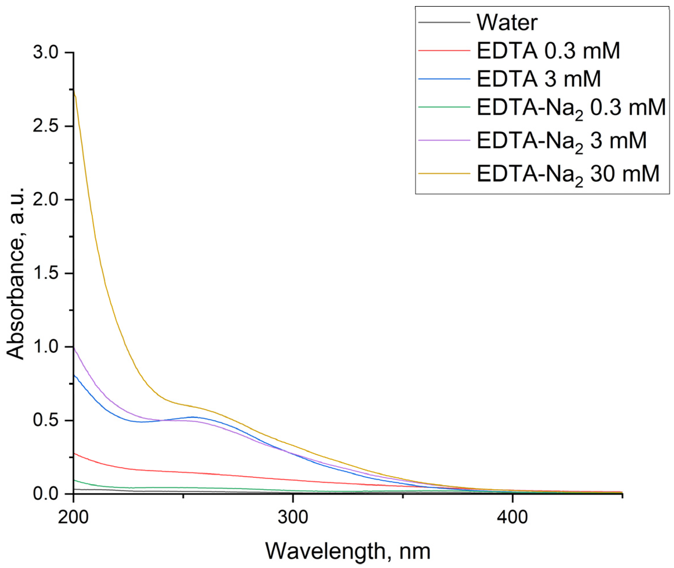2 concentration in the EDTA 0.3 mM sample than in the deionized water sample or in the EDTA-Na