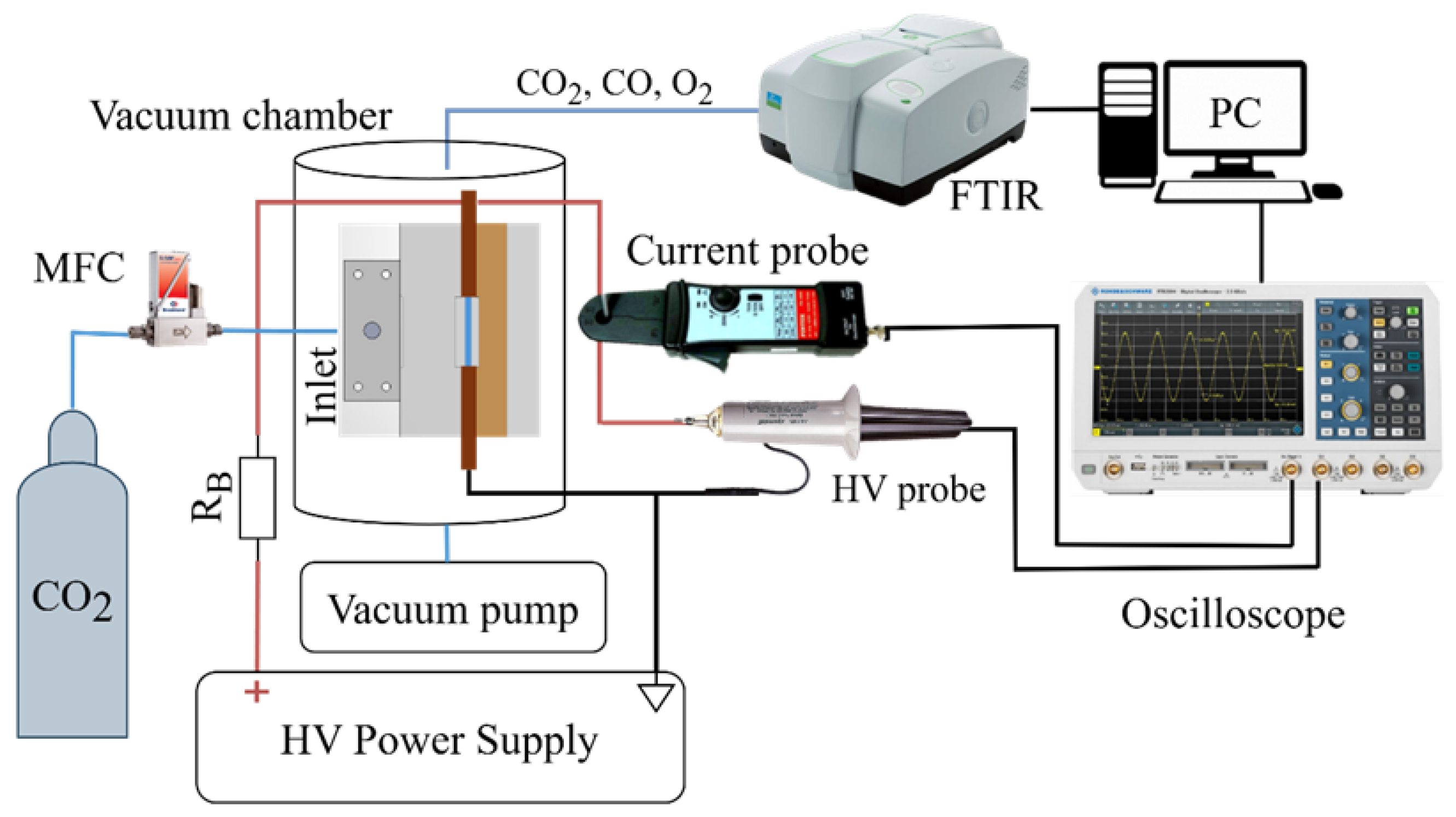 However, this significantly increases the discharge power per unit length. As a result, the discharge may be destroyed due to overheating, or very large gas flow rates must be used to prevent damage. Such high flow rates limit the range of conditions available for optimizing CO2 conversion and can even break the stabilization of the discharge. A much more flexible way is to use pulsing at high current and to control the overall power by adjusting the duty cycle. With respect to discharge optimization, pulsing provides additional degrees of freedom, and the CO2 conversion can be optimized with respect to several parameters (gas flow, duty cycle, frequency, discharge current, etc.). This is why we developed a pulsed power supply that produces high-current pulses around 500 mA and maintains a current of 50 mA between the pulses. The sustained low current of 50 mA between the high-current pulses is necessary in order to preserve the plasma channel and, thus, to avoid the necessity of gas breakdown at every pulse, i.e., the necessity of very high voltage. This ensures operation of the discharge in the arc regime during the pulses and gives the experiment stability and reproducibility while maintaining similar discharge power. During the low-current period, the discharge is normally in the glow regime, although this is not guaranteed, since it is possible to operate in the arc regime if the cathode is hot enough.