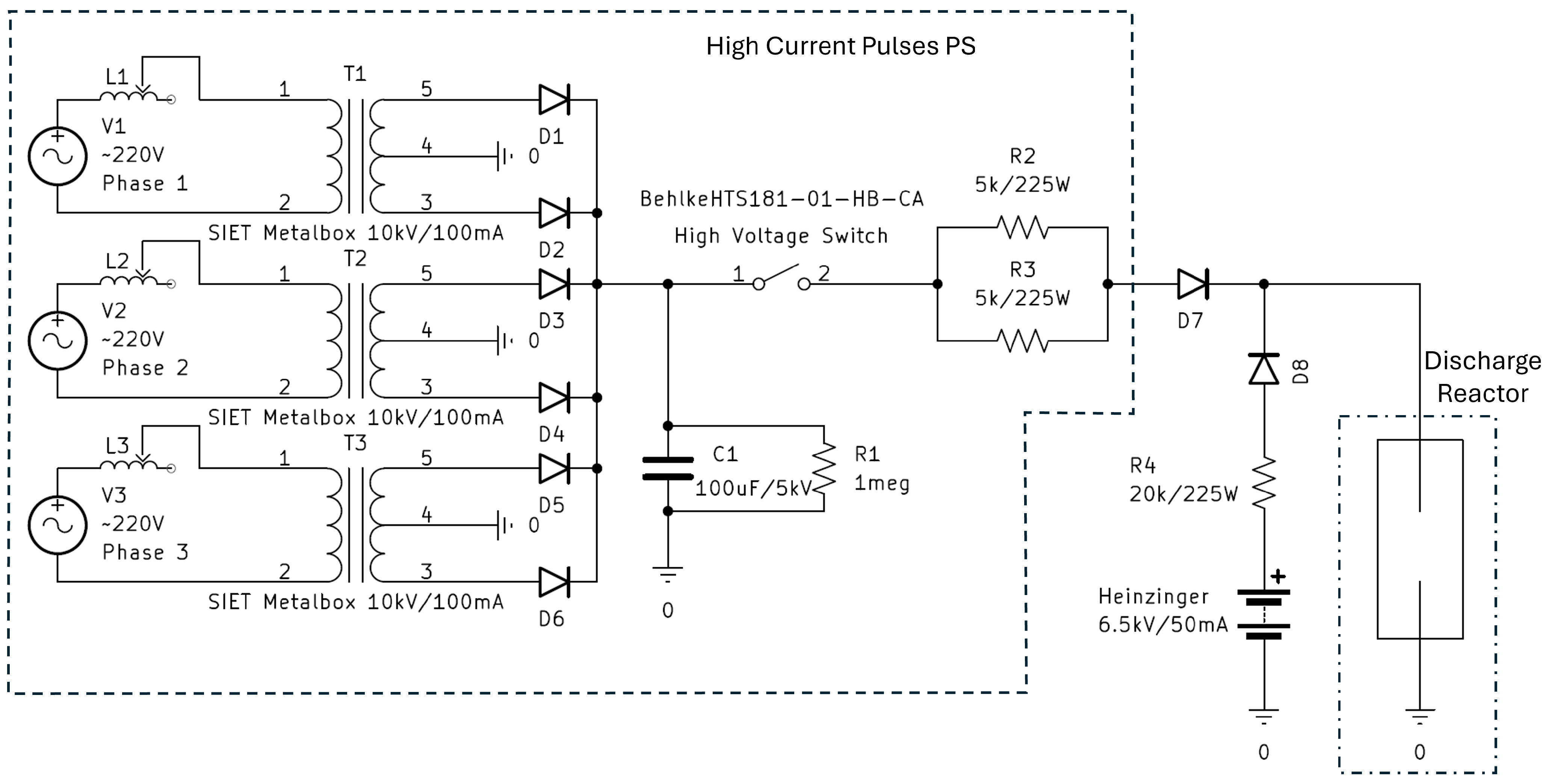 Initially, the discharge was designed to operate with a DC power supply with fixed discharge current. However, during the DC operation of the discharge, we observed instabilities in the discharge regime at lower pressures (200 mbar) and currents (<200 mA), caused by stochastic transitions between glow and arc regimes. In this work, the terms “glow” and “arc” refer to different cathode-spot formation mechanisms. The glow regime is characterized by a large spot sustained by secondary electron emission, whereas the arc regime features a smaller, hotter spot sustained by thermo-field emission. We assume that the different regimes do not affect significantly the plasma column, as was shown in several studies for stabilized arc and glow discharge at atmospheric pressure [