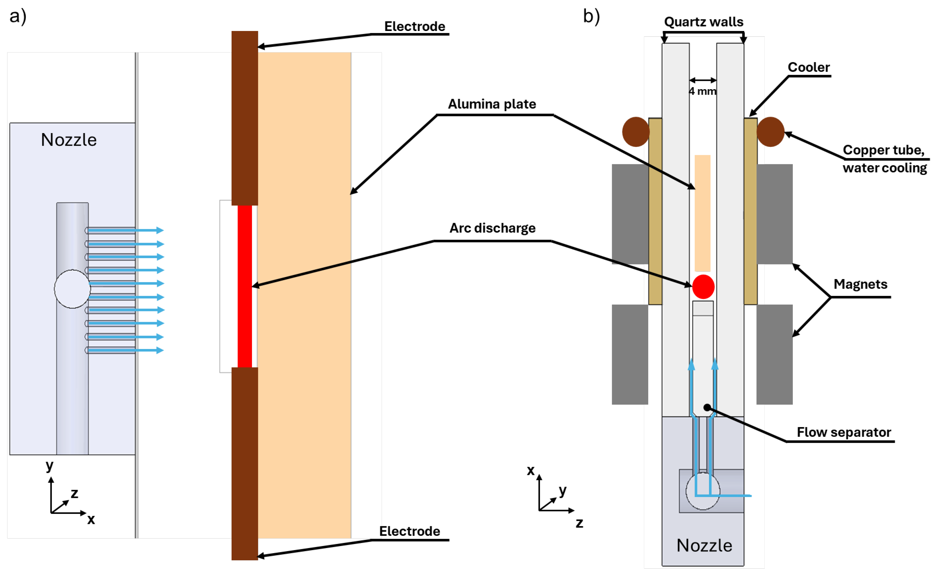 26]. This is why adding a certain amount of distance between the discharge and the cooling region is necessary—in our case, 5 mm from the electrodes. We suspect that for every discharge reactor, plasma power, and flow rate, there exists an optimal distance between the discharge and the cooling region. Finding that distance would require numerical simulations and/or in situ measurements of the spatial evolution of CO concentration, both of which are outside the scope of this paper and may be objects of future studies.