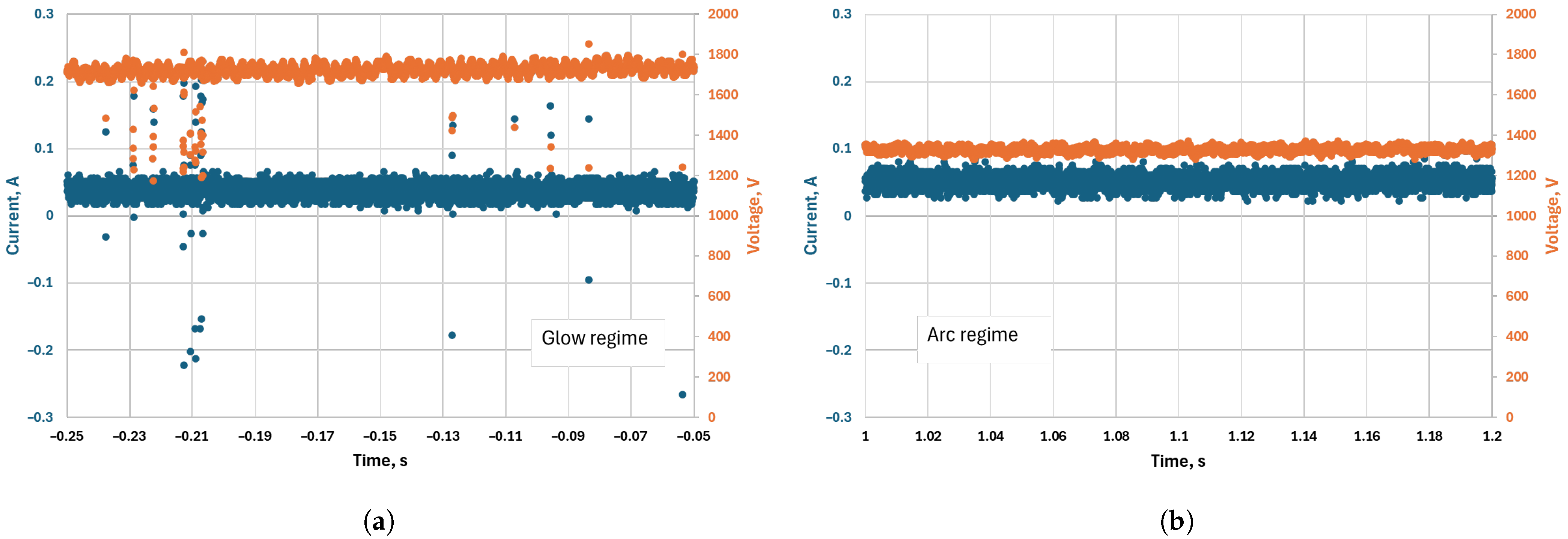 36]. The change in the discharge regime leads to a strong variation in the voltage drop at the cathode region—in the arc regime, the voltage drop is typically 10–15 V, while in the glow regime it is in the order of 300–500 V for CO
