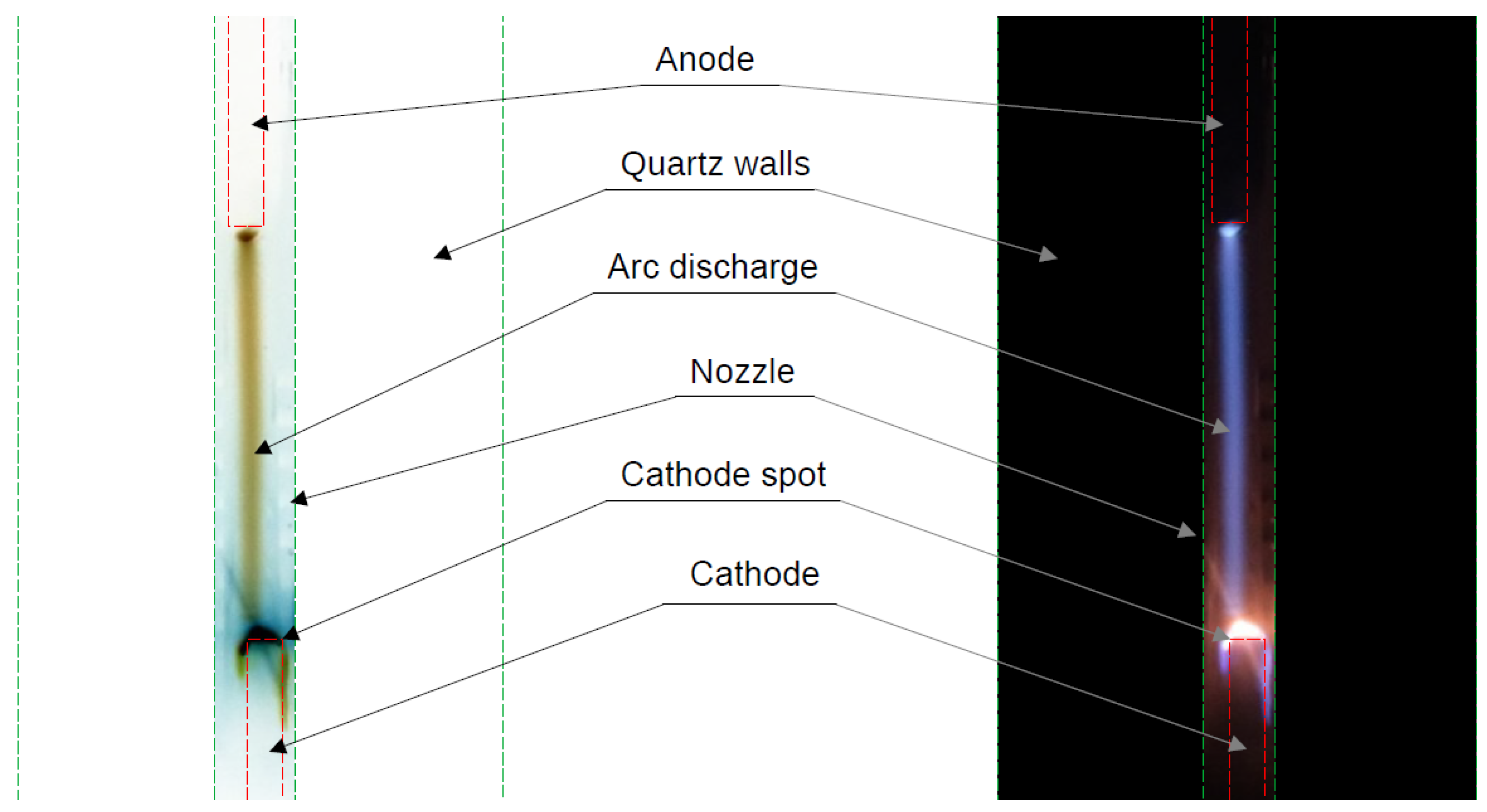 Figure 7). The oscillograms were taken at a pressure of 350 mbar, a current of 50 mA, and a gas flow rate of 4 L/min. In this case the voltage was around 1800 V in the glow regime and 1400 V in the arc regime, i.e., a 400 V difference and, thus, around 25% lower power for the arc regime. The different regimes were accompanied by different visual behavior observed during the experiments. A large dim cathode region (spot), covering the whole available cathode area, indicated the glow regime, while a highly localized cathode spot producing very bright light from a point light source indicated the arc regime. A photograph of the discharge while it was operating in the glow regime was also taken, where the glow cathode spot is clearly visible (