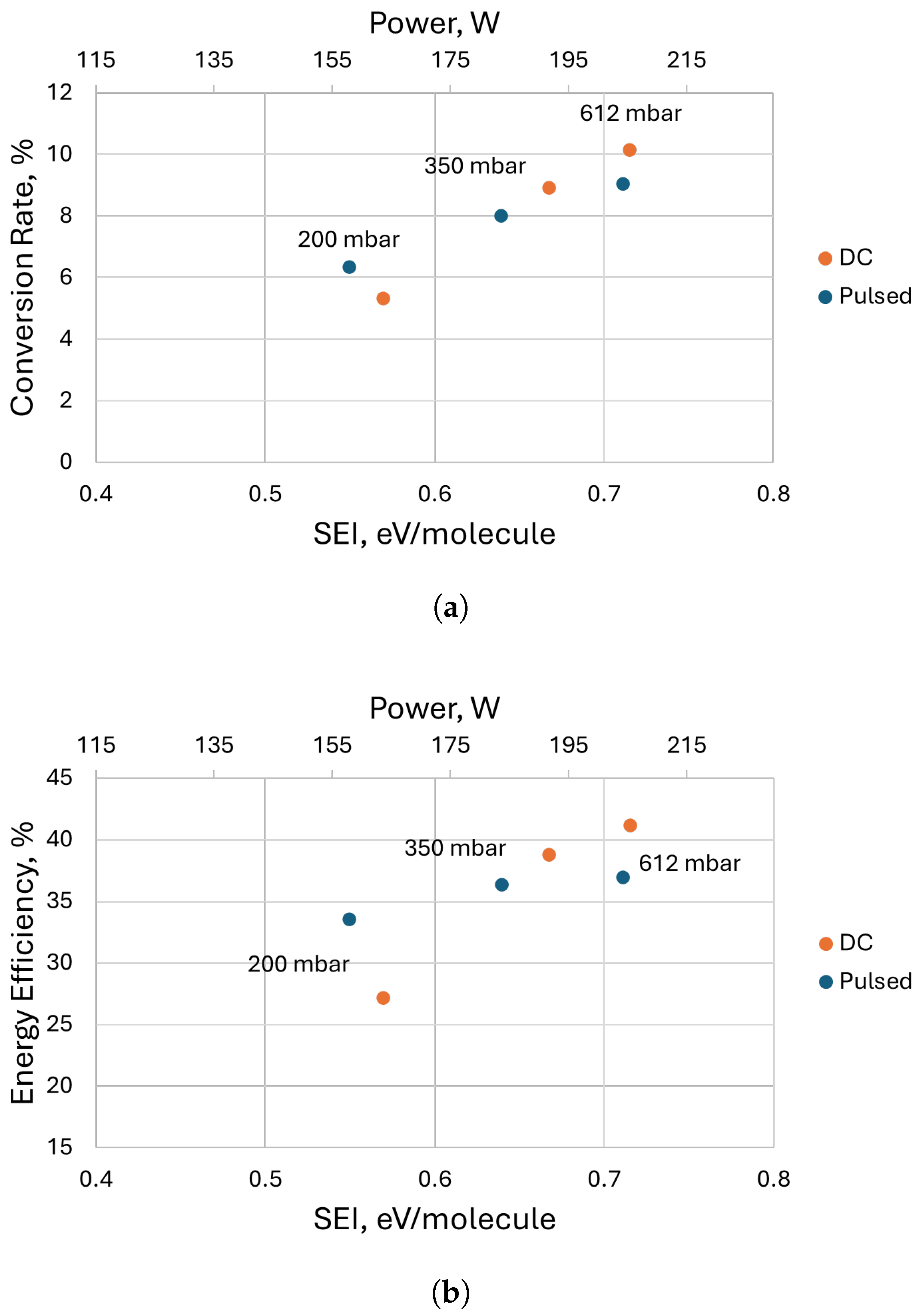 = 0.25. The current values of the measurements made with the DC supply were chosen such that the power consumption of the DC discharge was similar to that obtained with the pulsed power supply. It can be seen that, at 200 mbar, the pulsed power supply performed much better than the DC power supply in terms of both energy efficiency and conversion rate for similar power and
