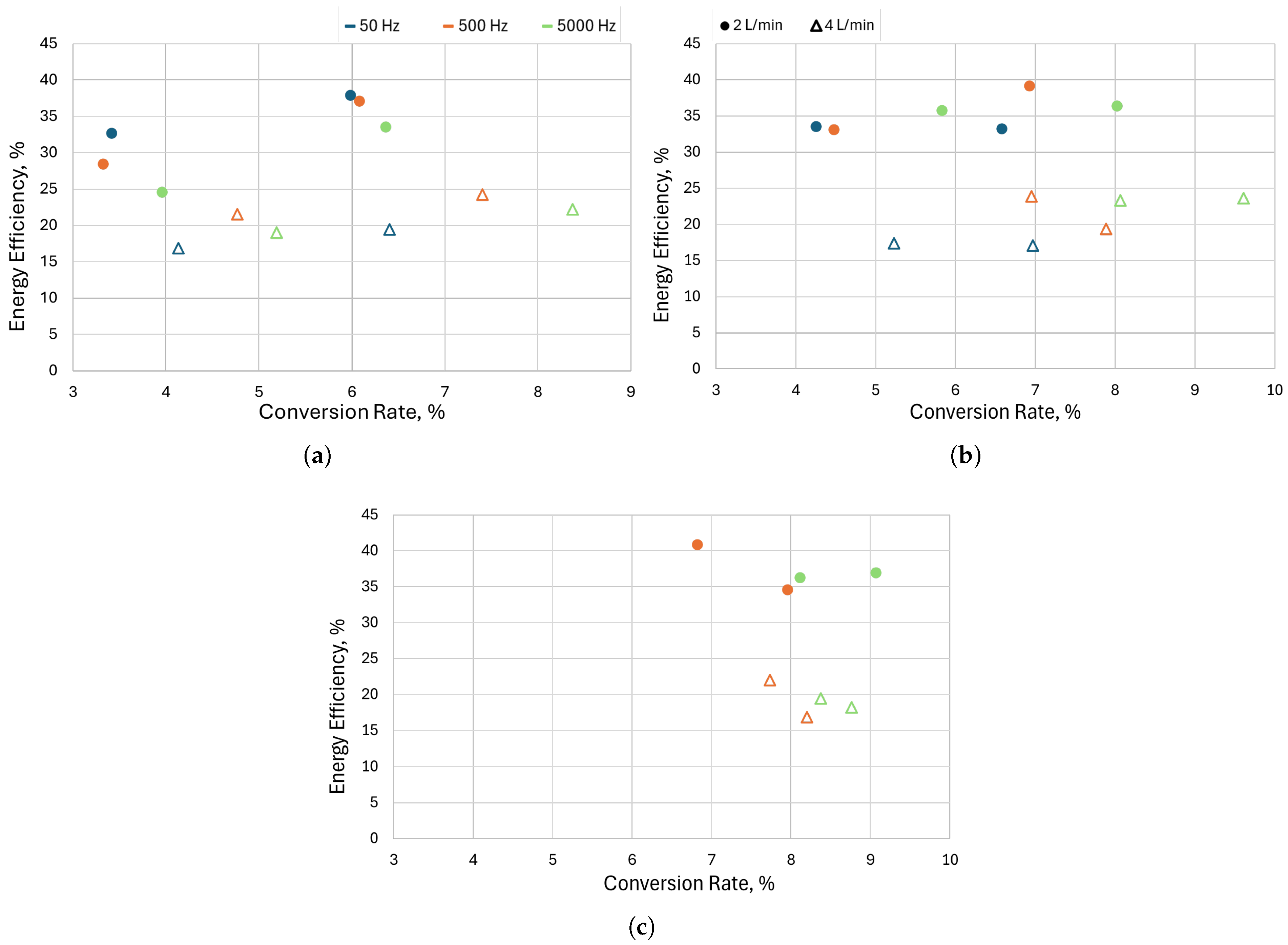 Figure 14b), the highest improvements in terms of conversion rate and energy efficiency are achieved at