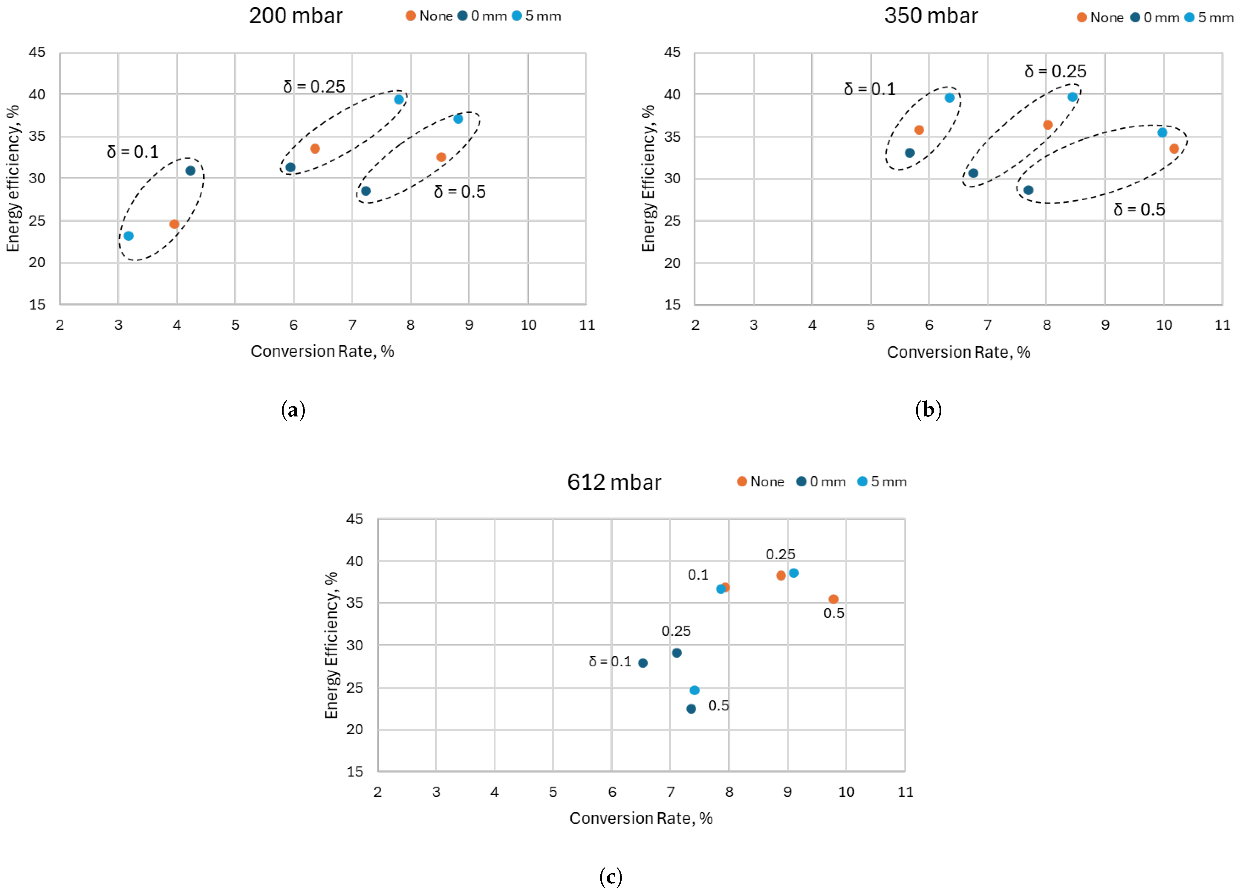 Here, the best results for the conversion rate were achieved by both the “5 mm” and “None” configurations at a pressure of 350 mbar and duty cycle 0.5—around 10%—while still retaining a relatively high energy efficiency of 35%. The highest energy efficiency at this flow rate was around 40% at a conversion rate of slightly above 8%, achieved by the “5 mm” configuration at a pressure of 350 mbar and duty cycle 0.25.