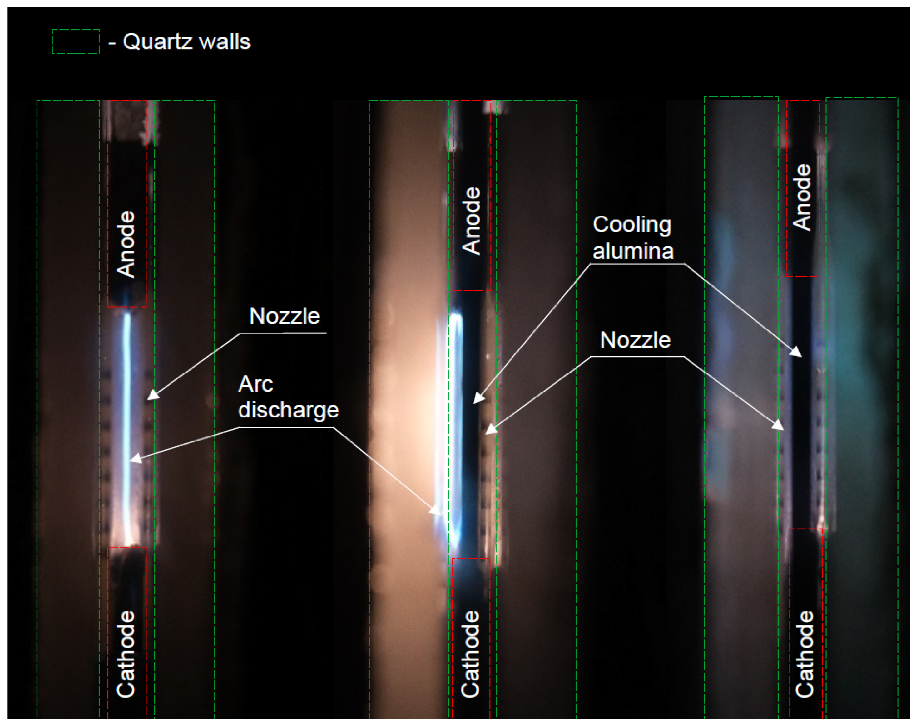 Figure 13, pictures of different possible situations are shown. The left picture shows a stabilized arc column in the middle of the gas channel in the case without quenching alumina. The middle picture shows a discharge with quenching alumina, where the arc column is attached to the left quartz glass. In the right picture, the arc column is behind the quenching alumina and is not visible.