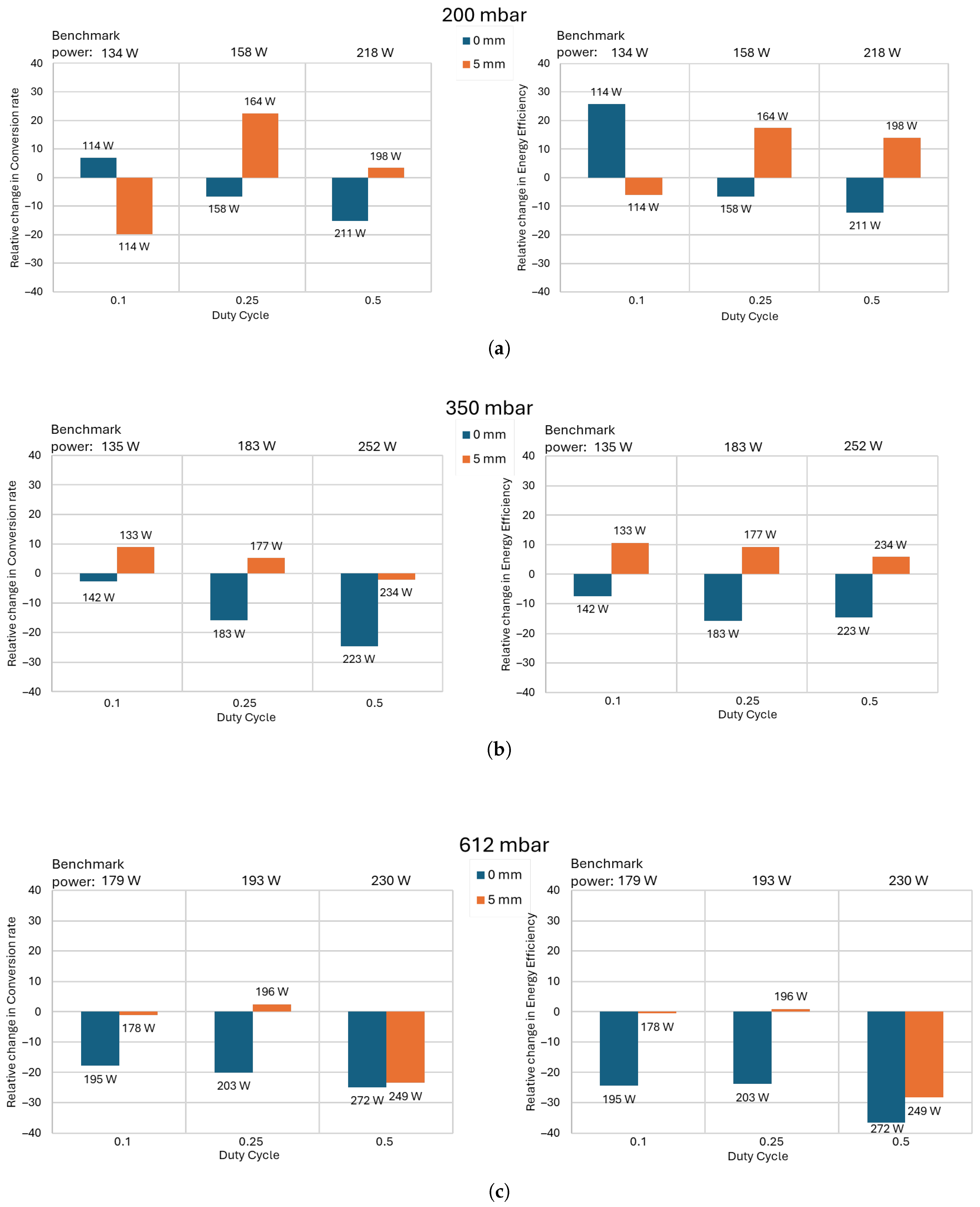 Figure 14c), the relative change is insignificant and is in the order of the uncertainty. The exception is the relative change at a duty cycle of
