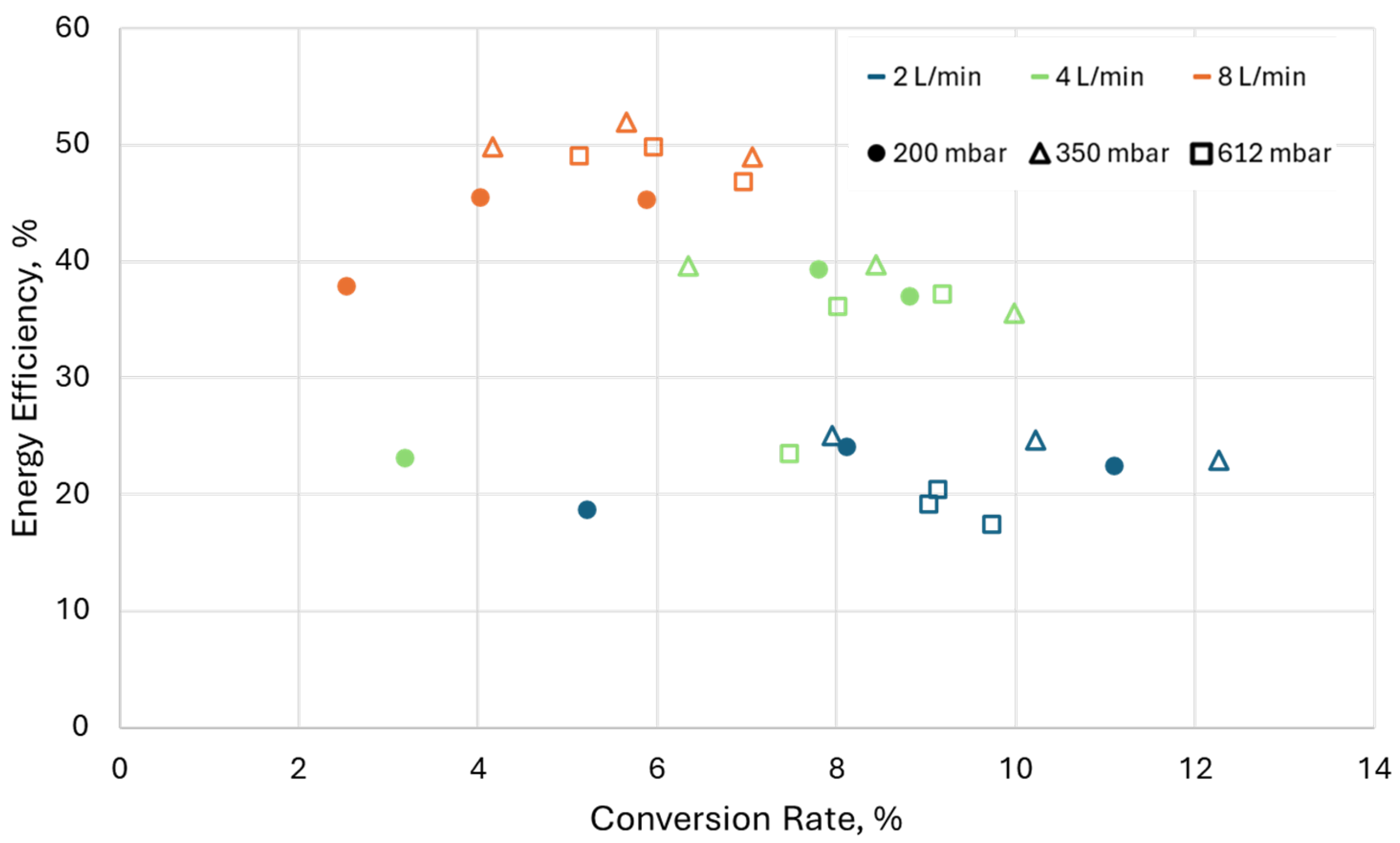 2 conversion rate. A maximum conversion rate of slightly above 12% at a corresponding energy efficiency of 23% is achieved at a pressure of 350 mbar, a flow rate of 2 L/min, and a duty cycle of 0.5. On the other hand, a maximum energy efficiency of around 50% is achieved at a flow rate of 8 L/min and a maximum conversion rate of 7%. Overall, the results show the expected dependencies—an increase in mass flow rate increases the energy efficiency but lowers the conversion rate. The lowering of the conversion rate is due to the decrease in the residence time of the gas in the discharge. An interesting result is the overlap of the conversion rates between different flow rates, especially when comparing 2, 4, and 8 L/min, where for the same conversion rate we achieved higher energy efficiency at higher mass flow rates. For example, at 2 L/min and a conversion rate of around 8%, we achieved an energy efficiency of 25%, while for the same conversion rate we achieved an energy efficiency of around 35–40% when using 4 L/min. This is most probably a result of the quenching, which allows for increasing the thermal dissociation without sacrificing the conversion rate via the recombination reaction. Another observation is the lack of strong dependency of the results on the pressure part of the result, where the arc is attached to the quartz wall.