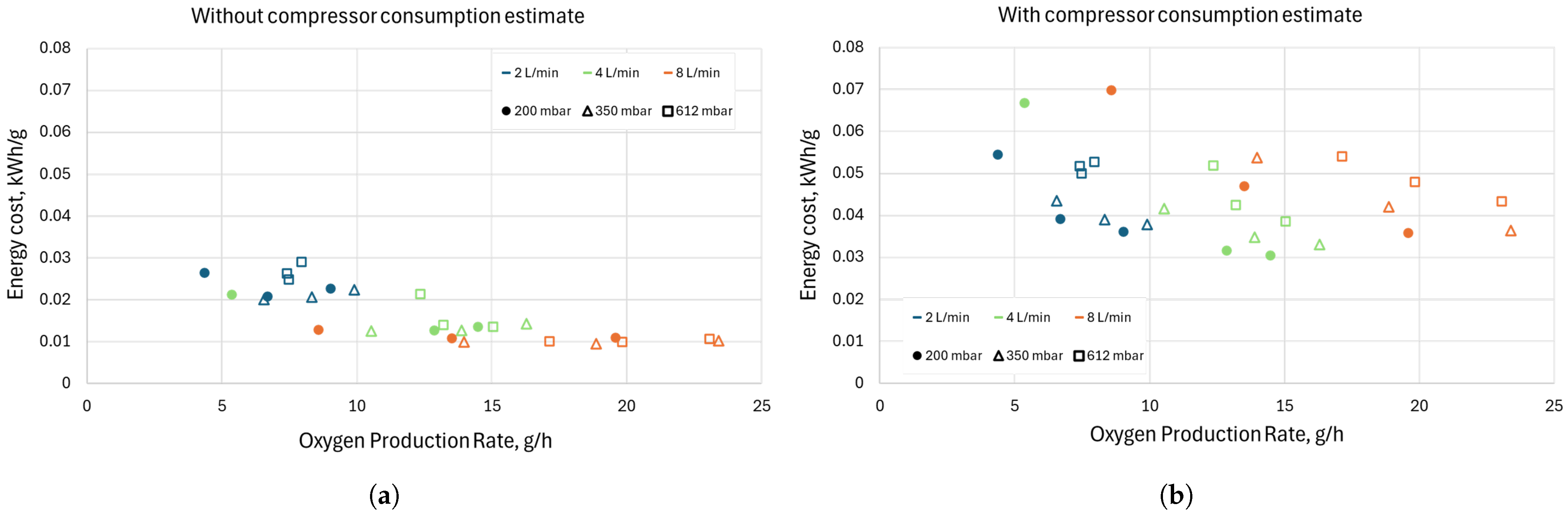 Figure 16a presents the energy cost and oxygen production for all the aforementioned conditions. In terms of oxygen production rate and energy cost, the highest values were obtained at a mass flow rate of 8 L/min for all studied pressure values. The maximum oxygen production rate was around 23 g/h, while the energy cost was around 0.01 kWh/g (duty cycle 0.5). Looking at these results without adding an energy cost for compression of the Martian atmosphere, it would seem that higher mass flow rates increase the production of oxygen while also lowering the energy cost. Thus, it seems that, for the best results, the energy efficiency is a more important parameter than the CO