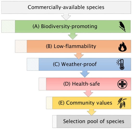 A process for selecting plant species with resilient characteristics for gardens in fire-prone regions at the urban–wildland interface. The process begins at step (A) with the choice of biodiversity-promoting plant species; then, the process gradually reduces the pool of appropriate species through selection of species that are (B) low on the flammability spectrum, (C) resilient to future climate change, (D) pose minimal health risks to humans, and (E) meet community (including individual) values. This leads to a final selection pool of plant species from which to choose resilient garden species. The stippled boxes next to each selection stage represent those species excluded at each stage.