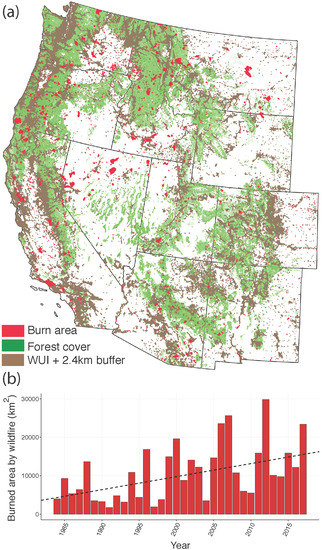 (a) 2017 burned area for the western United States (U.S.) (based on the Moderate Resolution Imaging Spectroradiometer (MODIS) burned area product (MCD64A1) for 2017 [5]); (b) annual burned area from large wildfires (>400 ha) in the western U.S. from 1984–2017, and Theil-Sen estimated trend (dashed line). Annual burned area is based on the Monitoring Trends in Burn Severity product (MTBS) for 1984–2015 [6], with modeled values for 2016 and 2017. Generalized linear models were fit using trends in the MODIS burned area product from 2001–2017, given trends in the MTBS product to predict modeled values for 2016 and 2017. All of the trend lines were statistically significant (p < 0.0001).
