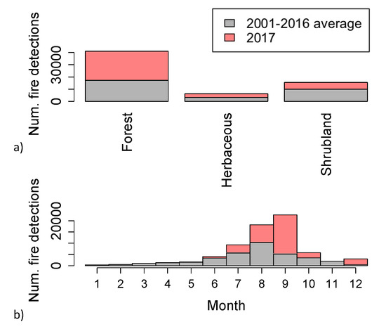 Histogram of fire activity (based on MODIS active fire detections) in 2017 for the western U.S. based on (a) landcover type burning (National Land Cover Database) and (b) month of burn, compared with the average between 2001–2016.