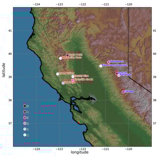 Study area map, including the stations considered. Stations are colored according to their frequency of Diablo-like event days per year. Station name colors correspond to the northern San Francisco Bay Area (NoBA) (red) and Sierra Nevada (blue) area.