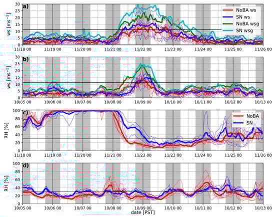 Station-wide average (thick lines) and individual stations (thin lines): Wind speed and wind speed gust (a,b) and relative humidity (c,d) for the north of Bay (NoBA) and western Sierra Nevada (SN) areas during the 22 November 2013 (a,c) and 9 October 2017 (b,d) Diablo-like wind events. The horizontal dark gray lines correspond to the minimum wind speed (a,b) and maximum relative humidity (c,d) criteria for Diablo-like events.