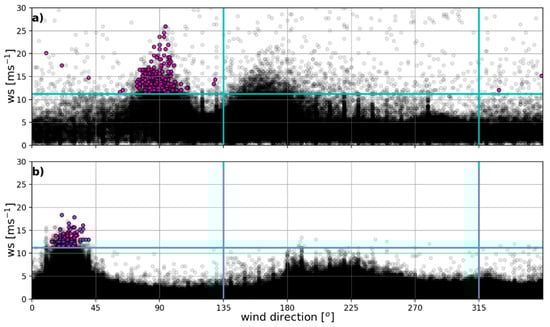 Scatter plot of wind speed versus wind direction for all available hourly observations at Duncan Canyon (a) and Knoxville Creek (b). Conditions satisfying the Diablo-like criteria of wind speed, wind direction and relative humidity are shown in magenta. Cyan lines correspond to the wind direction and wind speed criteria for Diablo-like events.