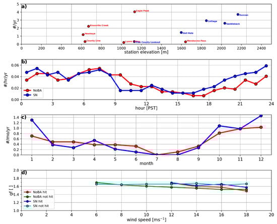 The average number of daily Diablo-like events per station per year that meet the criteria is shown, as a function of station elevation, in Figure 4a, and as colored dots, in Figure 1. The relationships shown indicate that interstation variability and micro-siting is likely an important component of observed Diablo-like wind conditions in the RAWS network. The large difference in event occurrence at the somewhat closely located stations Mendocino Pass and Eagle Peak suggests that station micro-siting issues cannot be fully excluded from our analysis. Since Eagle Peak experiences a high event count due to north-northeasterly events, we verified that our results are similar if we excluded Eagle Peak from the analysis. Hourly Diablo-like events per area, averaged as a function of the hour of day, is shown in Figure 4b. Daily Diablo-like events per area, averaged as a function of the month of the year, is shown in Figure 4c. Diablo-like wind events tend to occur overnight, through early morning most frequently (more than once per month) during late fall and early spring (October–March). Mid-to-late spring (April–June) and early fall (September) events are less frequent, occurring at a frequency of approximately one event per two months. They are quite uncommon during summer (July–August). These results are consistent with a previous analysis [16]. The results indicate a very similar diurnal pattern for the SN stations to the NoBA stations (Figure 4b). Monthly frequencies are also similar, although NoBA stations appear to have slightly more frequent events during December and January (Figure 4c). The SN stations indicate a modest relationship between Diablo-like events and station elevation, while the NoBA stations do not (Figure 4a).