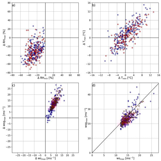 Daily Diablo-like event departures from Julian day climatology on a per station basis for the north of Bay Area (NoBA; red) and western Sierra Nevada (SN; blue) area observations of: Daily minimum and maximum relative humidity (a), daily minimum and maximum temperature (b), daily maximum wind speed and wind speed gust (c), and daily maximum wind speed versus daily maximum wind speed gust (d). The diagonal black line in (d) corresponds to a gust factor slope of 1.7.