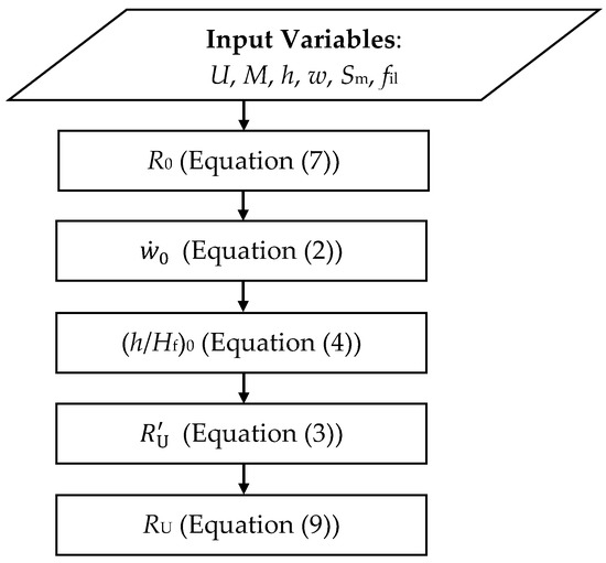 Flow diagram describing the RU model. Predicted RU were first computed using fil = 1 and afterwards fil was calibrated to minimize MBE between observed and predicted RU values. In vegetation composed of dead and live fuels, M was calculated using Equations (5) and (6). Sm was determined using Equation (8); when Sv and ρp values were not available, typical Sm values of 7.7 and 38.0 m2·kg−1 were considered, respectively, for foliage-based and grassland fuel complexes. Variables and abbreviations used are: U, wind speed (measured at ~2 m in field fires); M, fuel complex foliar moisture content; h, fuel bed height; w, fuel load; Sm, surface area-to-mass ratio; fil, ignition line length factor; R0, basic fire spread rate (i.e., no-wind and no-slope); , rate of fuel addition to the combustion reaction; Hf, flame height (measured from the base of the fuel bed); , adimensional wind-driven fire spread rate; RU, wind-driven fire spread rate; Sv, surface area-to-volume ratio; ρp, fuel particle density; MBE, mean bias error.