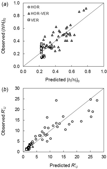 Observed vs. predicted: (a) ratio of fuel bed height (h) to flame height (Hf, measured from the base of the fuel bed) in windless conditions for the development data (Table 1); and (b) adimensional wind-driven fire spread rate () for the development data. Fuel bed arrangement: HOR—horizontal; HOR–VER—horizontal and vertical; VER—vertical. Fitted coefficients for Equations (3) and (4) are given in Table 2.