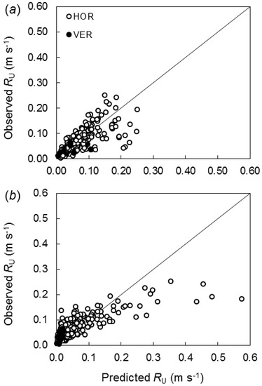 We predicted RU with the Rothermel model [23], for comparison, using the fire spread equations in SI units [36]. Fuel heat content, total mineral content, and effective mineral content were assumed constant and equal to 18,608 kJ·kg−1, 0.0555, and 0.01, respectively [23]. Moisture of extinction was set at 30% [33]. The remaining model inputs are w, h, Sv, ρp, M, and U. Because the Rothermel model was developed mostly from laboratory tests in the same experimental apparatus used by Catchpole et al. [33], correction of the predicted RU for the IL effect, as in Equation (9), was unneeded.