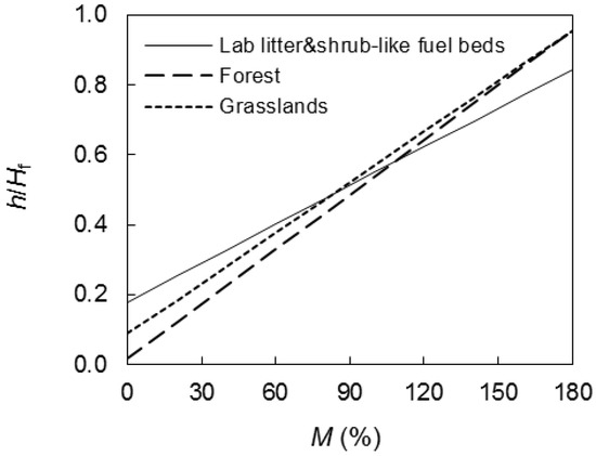It may be surprising that h/Hf of field fires could be roughly predicted based on M only, since flame geometry is expected to depend on other variables, such as fuel amount, but one must have in mind that some characteristics of natural vegetation vary within limited ranges around a mean value [34]. As a consequence, even when fuel characteristics are known to influence fire behavior metrics, sometimes they can be disregarded to obtain approximate estimates of a given fire behavior parameter.