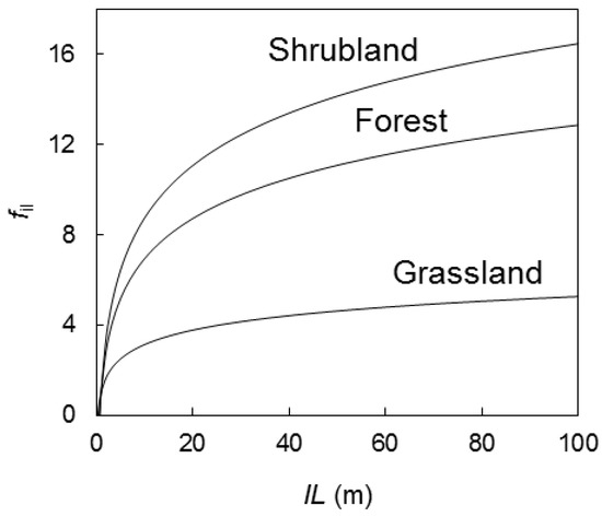 The correction factors to convert field experiments RU to quasi-steady RU for shrubland, forest, and grassland, yielded 1.3, 2.6, and 1.3, respectively. As a result, estimated fil to input in Equation (9) to predict quasi-steady RU in these vegetation types were 15.2, 12.4, and 5.0, respectively. The exploratory functions for fil as a function of IL (Figure 6) showed that potential quasi-steady RU was attained for much lower IL in grassland when compared to shrubland, which agrees with the robust results of Cheney and Gould [35] and Anderson et al. [20].