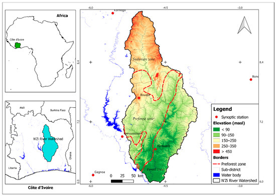 Located in central Côte d’Ivoire, the study area is the N’Zi River Watershed, a tributary of the Bandama River. It lies between 3°85′ W and 5°38′ W longitude and between 5°97′ N and 9°43′ N latitude, with an altitude ranging between less than 100 m a.s.l. in the south and more than 600 m a.s.l. in the north (Figure 1). With an approximate area of 35,309 km2, the NRW occupies nearly 11% of the national territory and straddles 80 small administrative entities (subprefectures) of the District of Yamoussoukro and eight administrative regions (Agneby-Tiassa, Belier, Gbeke, Hambol, Iffou, Moronou, N’Zi and Tchologo). Due to its longitudinal configuration, the NRW spans the major climatic regions of Côte d’Ivoire and is covered by forest ecosystems in the south, mosaic forest‒savannah ecosystems in the centre and savannah ecosystems in the north.